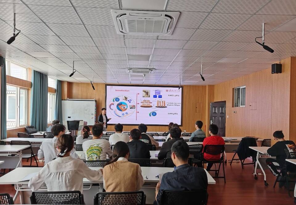 聂文琪以“Grouping supercapacitor fibers into rope: scaling up energy with a surging volume”为题,介绍了自充电纺织品的研究现状和发展趋势,讲解了采用编织技术将电容器可与纺织品高度融合,实现柔性电容器的开发设计,尝试采用摩擦纳米发电,开发高能量存储可与纺织品高度融合的纳米摩擦/超级电容器基自充电纺织品,用以满足可穿戴电子产品的能源供给。王震汇报了“抗菌壳聚糖/聚乙烯醇/非织造布复合多孔膜结构调控及颗粒物过滤性能研究”,系统介绍了采用非溶剂致相转化法制备多孔聚合物/非织造布复合膜微结构调控方法,为开发先进空气净化材料与技术提供一个新思路,并结合安徽省重点研发计划指南,分析了多孔膜与医用材料、污水处理材料以及空气净化材料结合的研究趋势,提出了自己的思考。与会师生针对相关问题展开了热烈的讨论,现场学术氛围浓厚。
