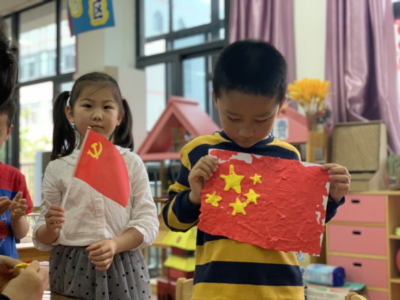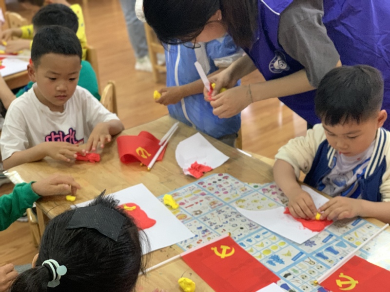 接着,志愿者带领小朋友们用黏土做起了党旗,红色的旗面,金黄色的镰刀和锤头,小朋友们在动手实践中加深了对党的认识和理解。