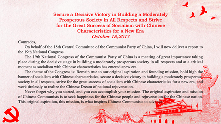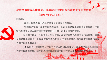 本次宣传主要集中于习近平在中国共产党第十九次全国代表大会上的报告。大会的主题是:不忘初心,牢记使命,高举中国特色社会主义伟大旗帜,决胜全面建成小康社会,夺取新时代中国特色社会主义伟大胜利,为实现中华民族伟大复兴的中国梦不懈奋斗。