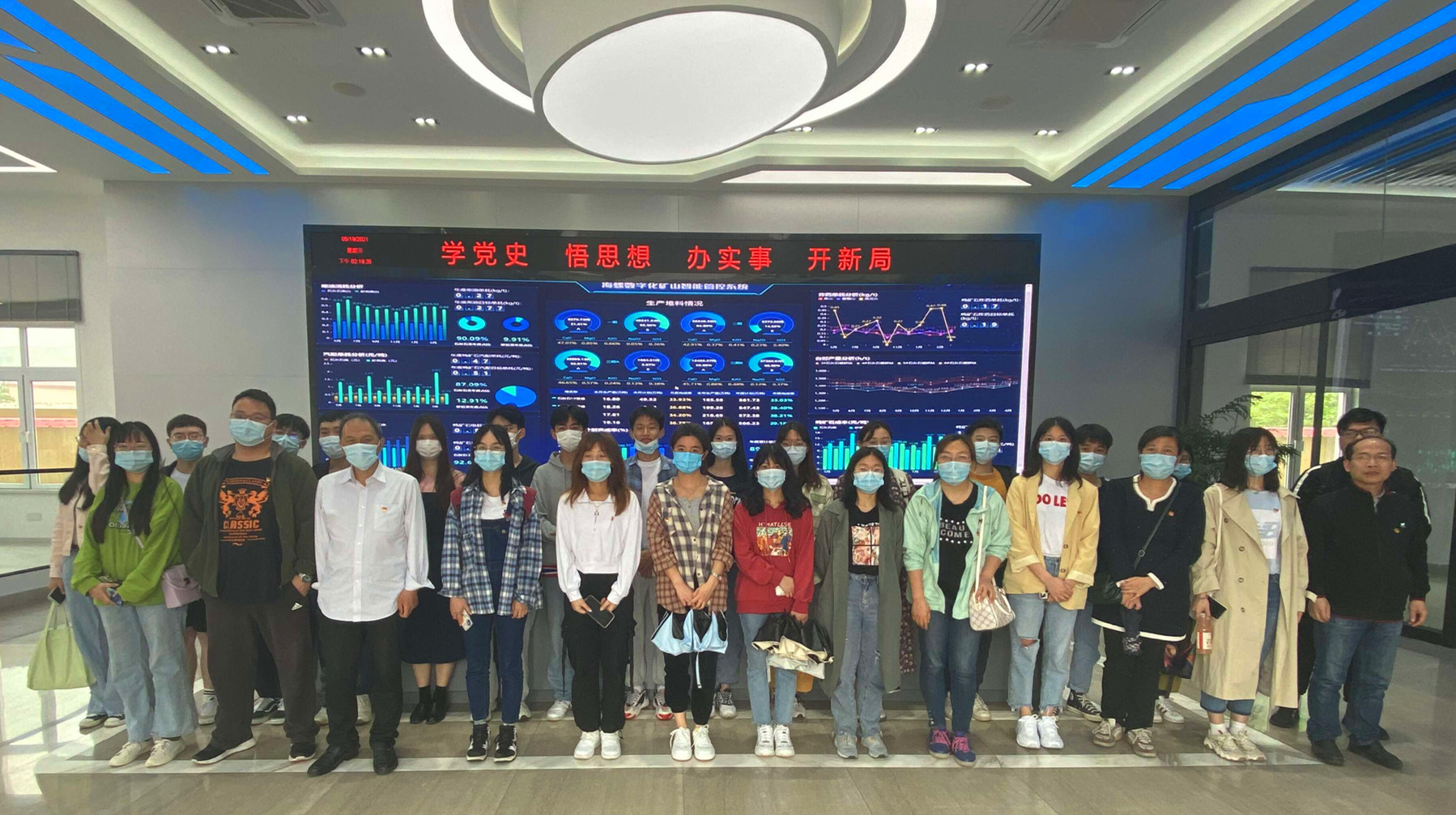 在矿山智能管控室内,三维可视管控平台、矿车自动调度系统通过大屏幕分别显示矿山各路口实时动态、石灰石在线监测数据等信息,让师生直观了解海螺集团“智慧矿山+智能工厂”的工作运行模式,感受生产管理模式的大变革。