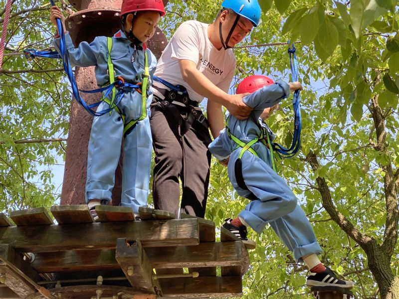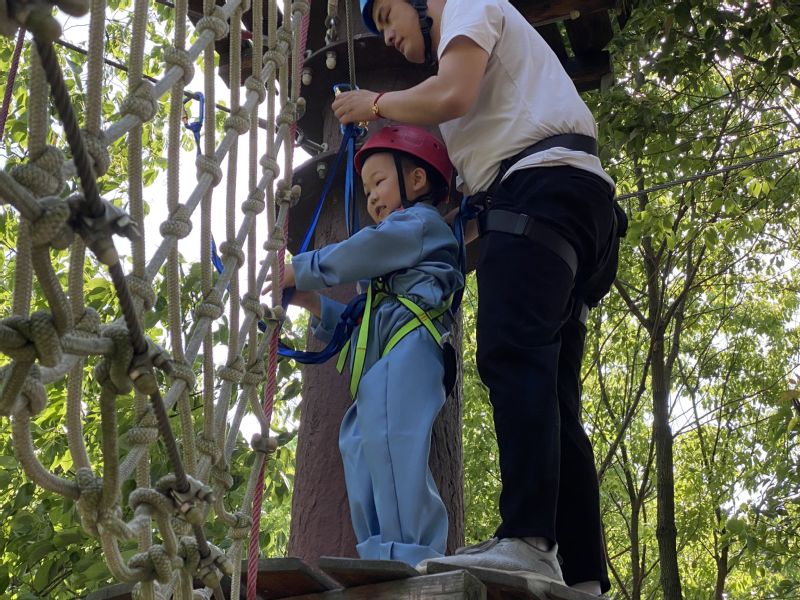 本次活动旨在对孩子们加强爱国主义教育,锻造坚韧的意志品质。结合活动主题,本次活动设计了国防运动、丛林穿越两个体验项目,根据年龄大小分成三个组别的孩子们在拓展老师的带领下,穿上红军服、戴上红军帽,显得既兴奋又紧张。兴奋也许是因为孩子们的内心也有一个军人梦,红军在他们的心目中都是大英雄,内心自然无比自豪与骄傲,紧张也许是即将体验英雄前辈们的艰辛与不易和从未体验过的凌空栈道和国防运动项目。活动中,孩子们或团队作战或独立前行,完成一个又一个小挑战,既收获了户外拓展的挑战和快乐,又提高了团队合作精神。