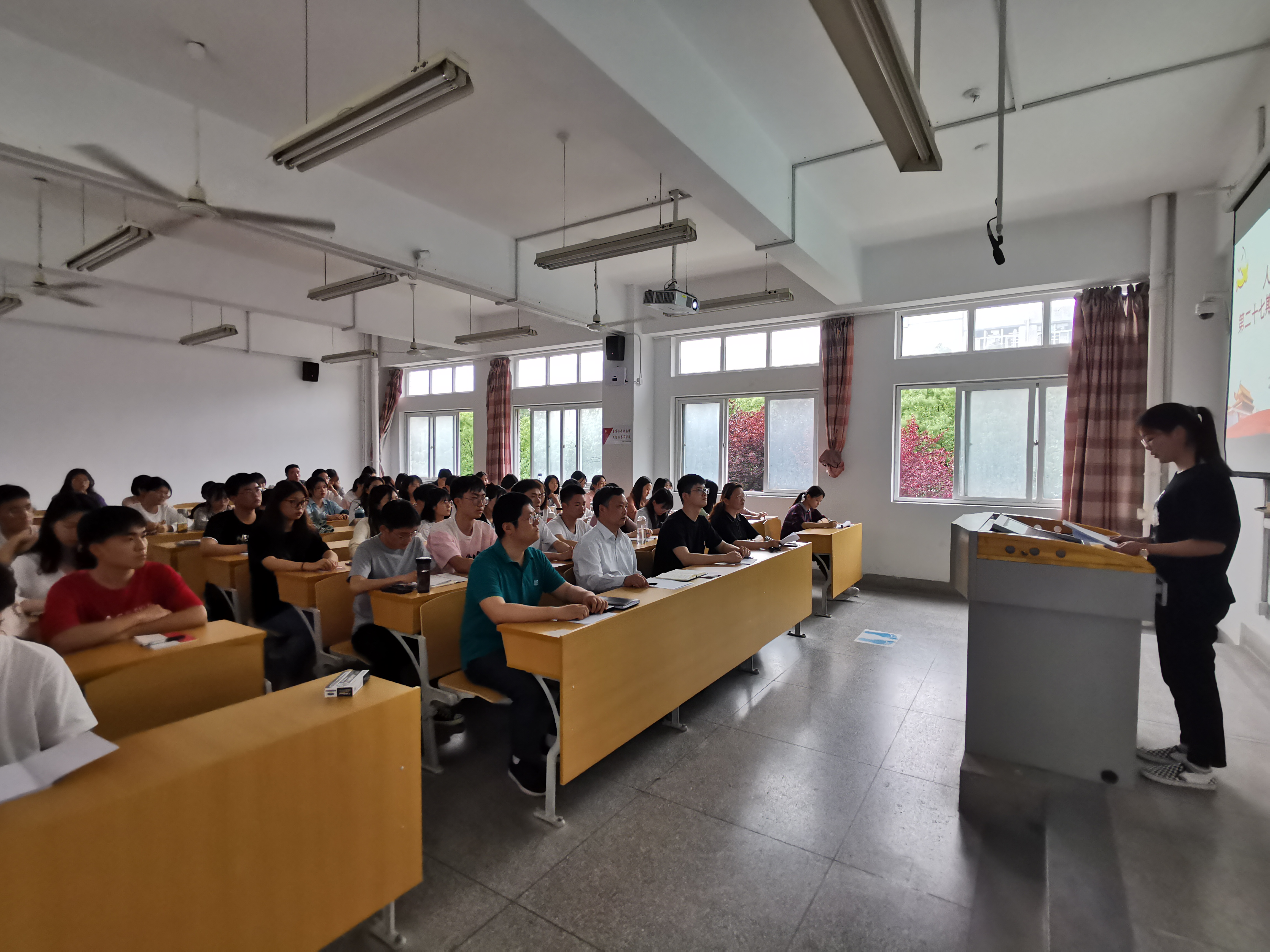 本网讯 为深入学习贯彻习近平新时代中国特色社会主义思想,加强入党积极分子党的基本理论和基本知识教育,以昂扬姿态迎接建党100周年。人文学院分党校第二十七期入党积极分子培训班于2021年5月24日下午在4教204教室举行开班式。院党委书记邓英扣、党委副书记金艾裙、组织员、班主任以及本期培训班全体学员参加开班式,开班式由金艾裙主持。