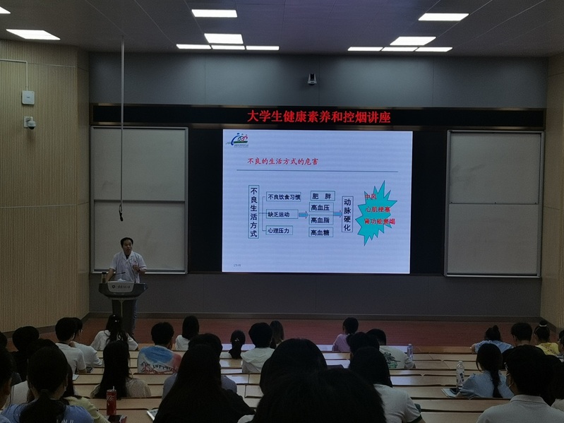 市疾控中心李喆老师在2教报告厅举办了 “大学生健康素养和控烟”的宣传讲座。介绍了我国普通人群中吸烟的现状和吸烟的危害,宣传健康的生活方式,向在场大学生发出健康倡导:合理膳食、适量运动、戒烟限酒、心理平衡。讲座图文并茂,生动幽默,主讲老师与在场学生进行知识问答的互动,增进了现场同学们的参与度。