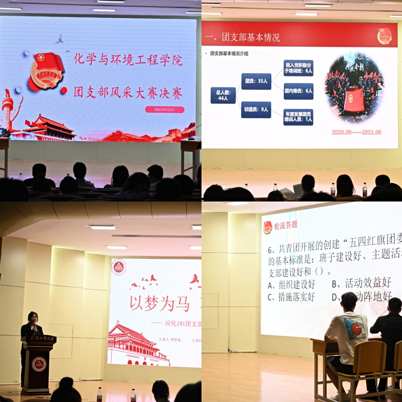 本届团支部风采大赛自5月份启动以来,共49个团支部参与比赛,经过院团委的初赛及复赛选拔后最终筛选出8个团支部进入决赛。本次决赛共分为“知识竞赛”和“PPT演讲”两部分。在知识竞赛环节中,各团支部选手准备充分,应变灵活,充分展现了我院学生丰富的党史、团史知识和团结协作的精神。随后便进入最为激烈的“PPT演讲”环节,各团支部的演讲选手通过精心准备、到位讲解及才艺表演,介绍了各自团支部的组织及制度建设,展现了学生们蓬勃向上的青春力量,其中丰富的团支部特色活动,如志愿服务活动和暑期三下乡实践等都体现出化环院学子昂扬进取的精神风貌。学院团委书记也对本次比赛进行点评和总结,并给广大青年团员上了“感受觉醒年代”的党史教育专题宣讲课。