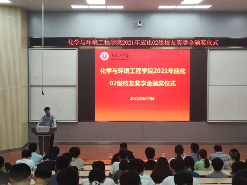 本网讯 为回馈母校,感恩母校,勉励化环学院应化专业莘莘学子,应化02级校友设立了校友奖学金。6月4日下午,应化02级校友奖学金举行了颁奖仪式。应化02级校友代表、苏州大学博士生导师程亮,安徽卫生健康职业学院教师余晨辉,化环学院党委书记水心宝、副院长高建纲、党委副书记胡承功、副院长朱贤东、徐大勇等出席会议,应化系教师代表、应化18级、19级获奖学生及应化20级新生参加本次仪式,仪式由朱贤东主持。