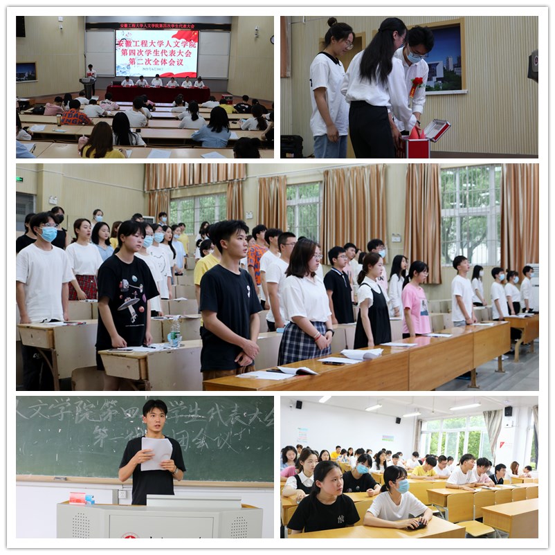 本网讯 安徽工程大学人文学院第四次学生代表大会于2021年6月10日下午在二教报告厅举行。人文学院党委书记邓英扣、党委副书记金艾裙,学院团委负责人,校学生会学生干部代表受邀出席大会,104名学生代表参加会议。