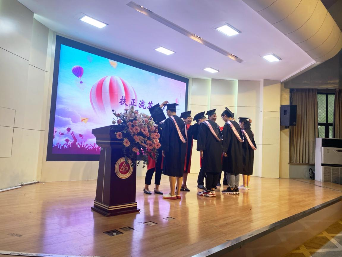 学院院长金成星、副院长唐雪梅等为到场毕业生一一扶正流苏并合影留念。毕业典礼在同学们精心准备的小合唱《老师好》的悠扬旋律中落下帷幕。