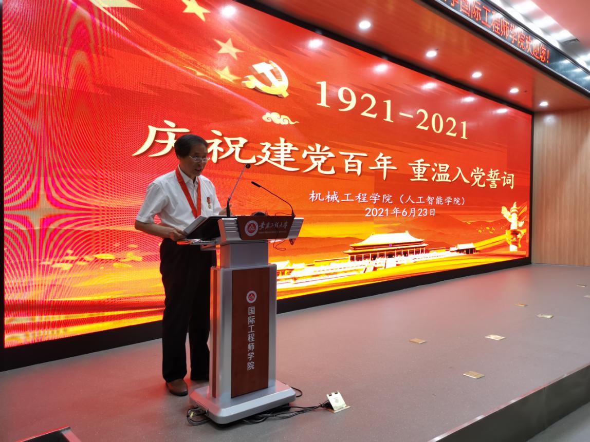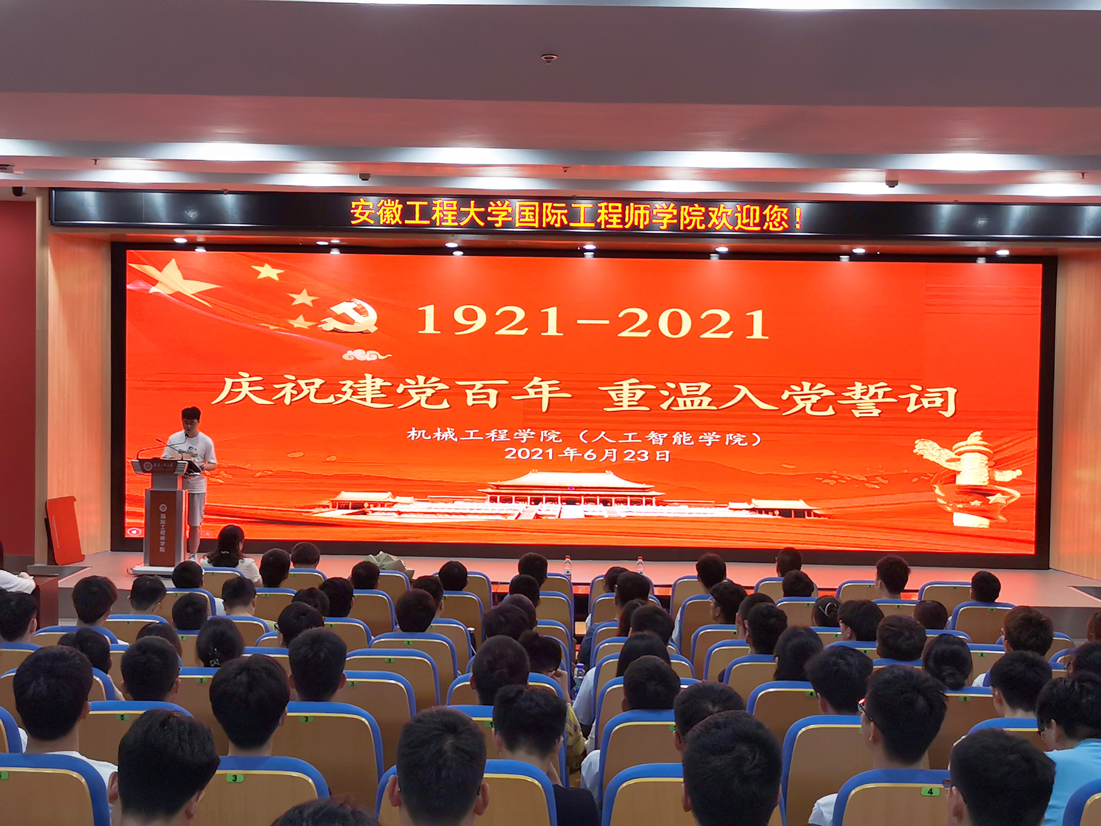 本网讯 为庆祝中国共产党成立100周年,深入推进党史学习教育,6月23日下午,机械工程学院(人工智能学院)在国际工程师学院大报告厅举行“庆祝建党百年,重温入党誓词”主题党日活动。学院党委副书记李文江、教师党员代表、2018和2019级全体学生党员以及研究生支部党员代表参加党日活动,活动特别邀请离退休党委苏自林老师参加。活动由学生支部书记王海燕主持。