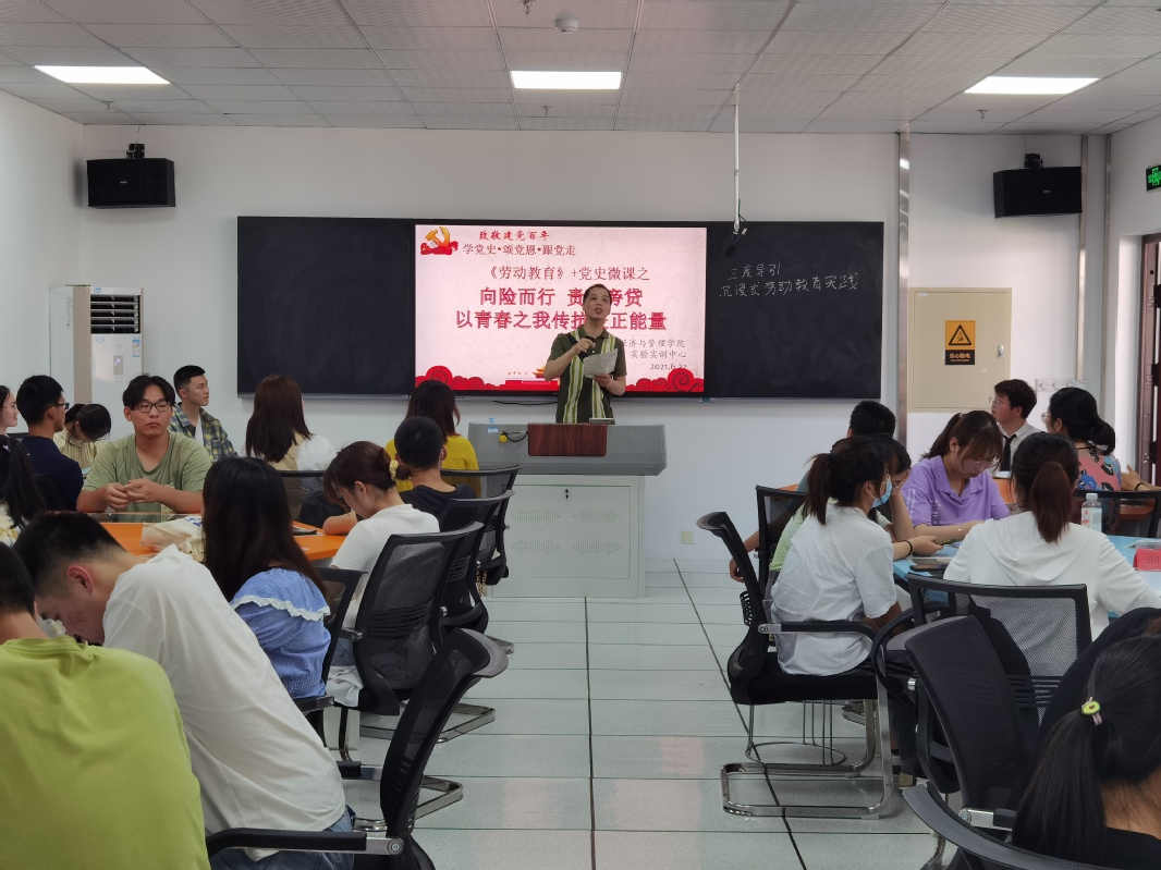 本网讯 学党史,知党情。经济与管理学院“党史微课+劳动教育”系列活动立足中国共产党百年历史新起点,进一步落实教育部及中组部关于劳动教育及党史学习教育的相关要求,旨在做好学校“三全育人”的协调育人工作。6月22日下午,“党史微课+劳动教育”系列活动在C座924开展。出席本次活动的有院党委副书记章兵、院团委副书记赵恒梅、院实验中心负责人以及党史宣讲团全体成员。章兵在本次活动中做题为《百年大党:不忘初心、牢记使命》的党史微课宣讲,为营销20级团日活动上了一堂生动的团课。