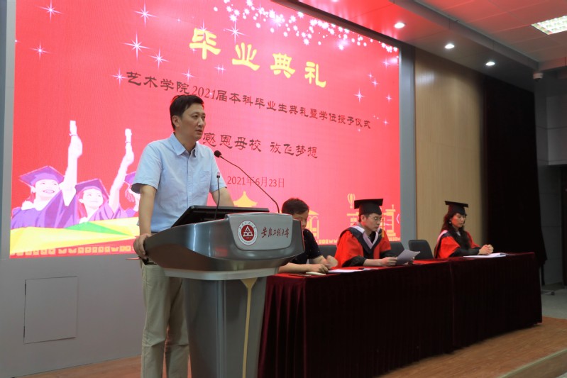 本网讯 6月23日上午九点,安徽工程大学艺术学院2021年毕业典礼暨学士学位授予仪式在五教117隆重举行。2021届毕业生代表齐聚一堂,以典礼见证成长与收获,并开启人生新的旅程与辉煌。参加仪式有院党委副书记胡家增、副院长张学东、王小元、院党委副书记任家钱、教师代表、毕业班辅导员及本科毕业生代表,仪式由任家钱副书记主持。