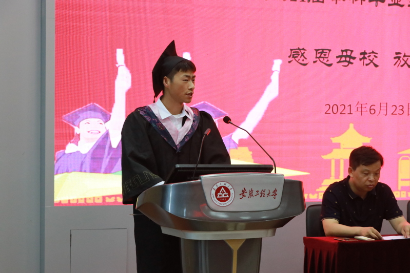 张学东副院长宣读及《关于授予2021届本科毕业生学士学位的决定》,王小元副院长宣读《关于表彰2021届本科生优秀毕业生的决定》,授予夏国文等17名本科生“安徽省优秀毕业生”称号,授予陈旭等26名本科生“安徽工程大学优秀毕业生”称号。