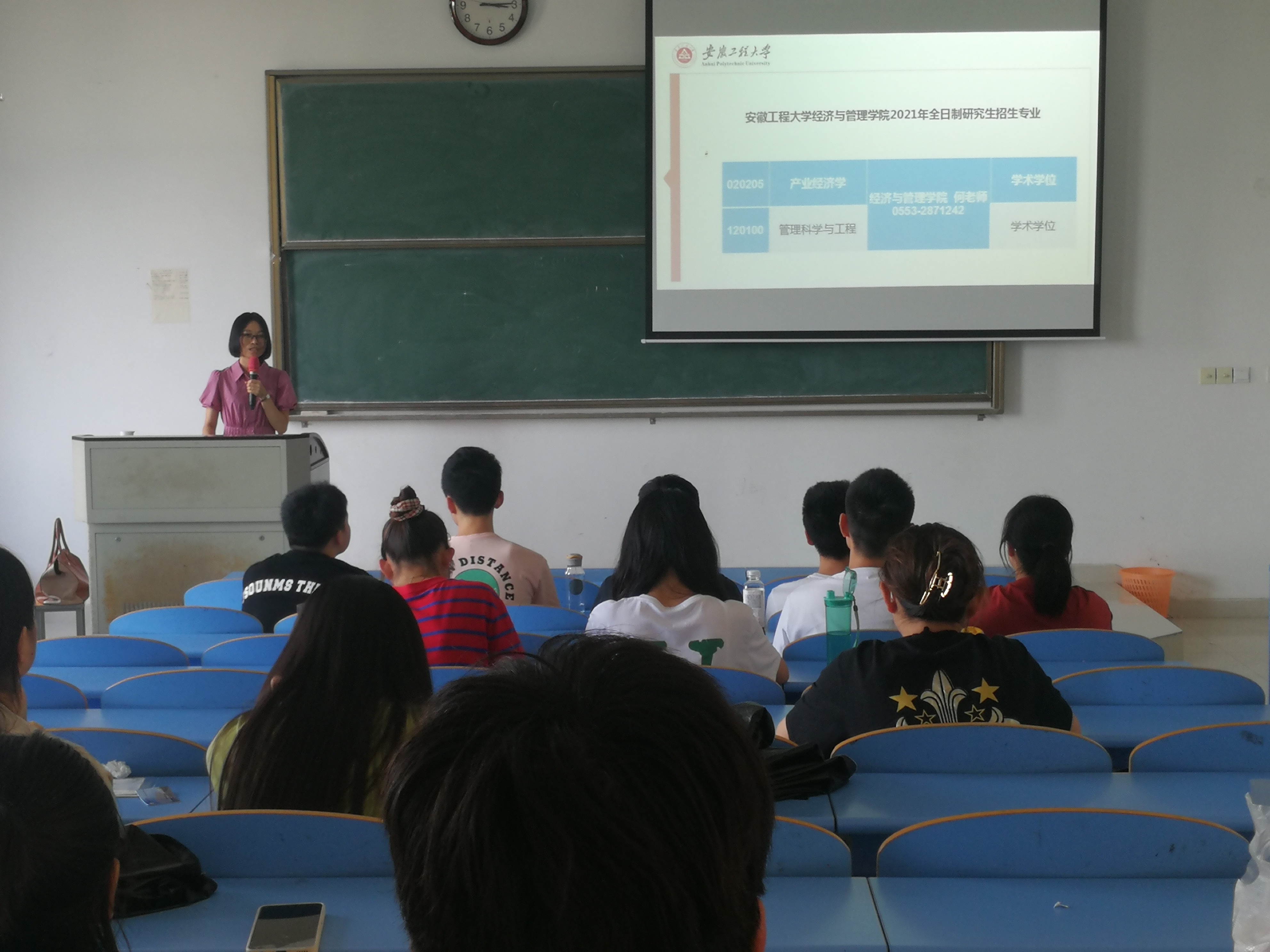 本网讯 6月23日,经济与管理学院章秀琴博士、操雅琴博士赴安徽信息工程学院开展研究生招生动员会。两位博士分别就我校基本情况、研究生教育情况、管理科学与工程学科和产业经济学学科的优势与特色、研究方向、师资力量、培养模式等进行了详细介绍。参加宣讲会的学生对专业历年录取情况、专业课考试科目、就业前景等进行了详细咨询,两位老师一一解答,现场气氛热烈。