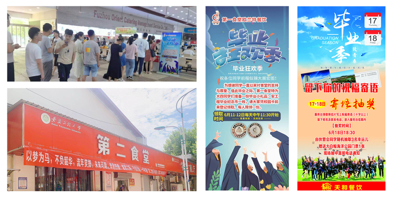 一食堂印制纪念币1500枚,在毕业季派送。二食堂以“青春不散场”为主题,开展明信片祝福寄语征集、发放纪念性明信片和纪念餐券、设立毕业季寄语签名墙、录制毕业季视频、推出毕业季特价菜肴活动。三食堂开展毕业季“青春无悔,筑梦前行”图片征集活动,免费发出餐券500余份。四食堂、东区食堂及松庐餐厅也以各种不同形式,开展毕业季暖心活动。
