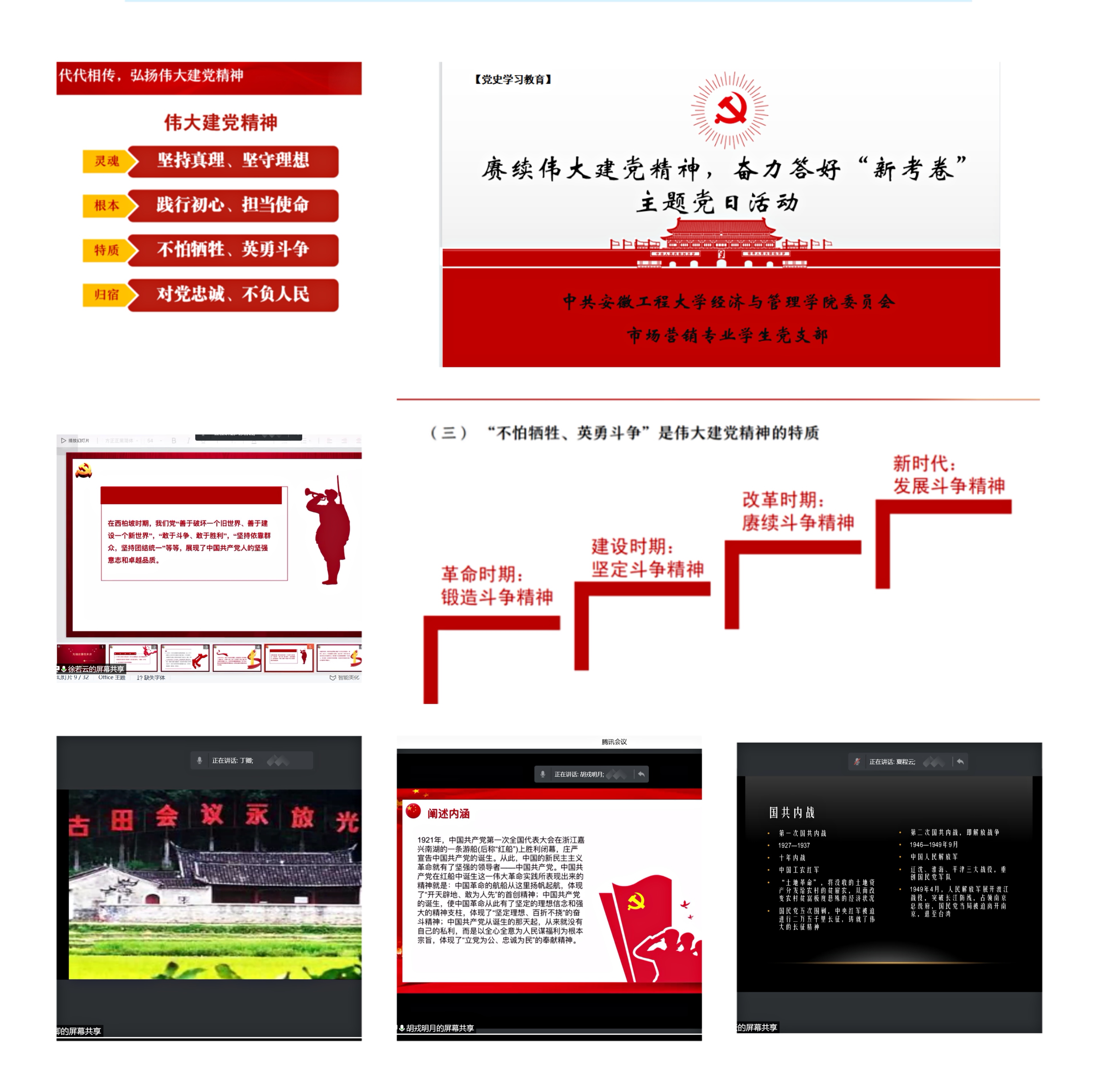 本网讯 “欲知大道,必先为史,知往鉴今,以启未来。”为深入学习研讨习近平总书记“七一”重要讲话精神,进一步推动党史学习教育走实走深,8月20日下午,经济与管理学院市场营销专业学生党支部以腾讯会议为平台,积极开展“赓续伟大建党精神,奋力答好‘新考卷’”“七一”讲话精神学习研讨主题党日活动。活动通过专题学习和交流分享的形式,由支部党员共同分享自己在学习中感受颇深的党史小故事,旨在激励党员深入学习习近平总书记在庆祝中国共产党成立100周年大会上的讲话精神,进一步学好党史,从百年党史中汲取磅礴奋进力量。