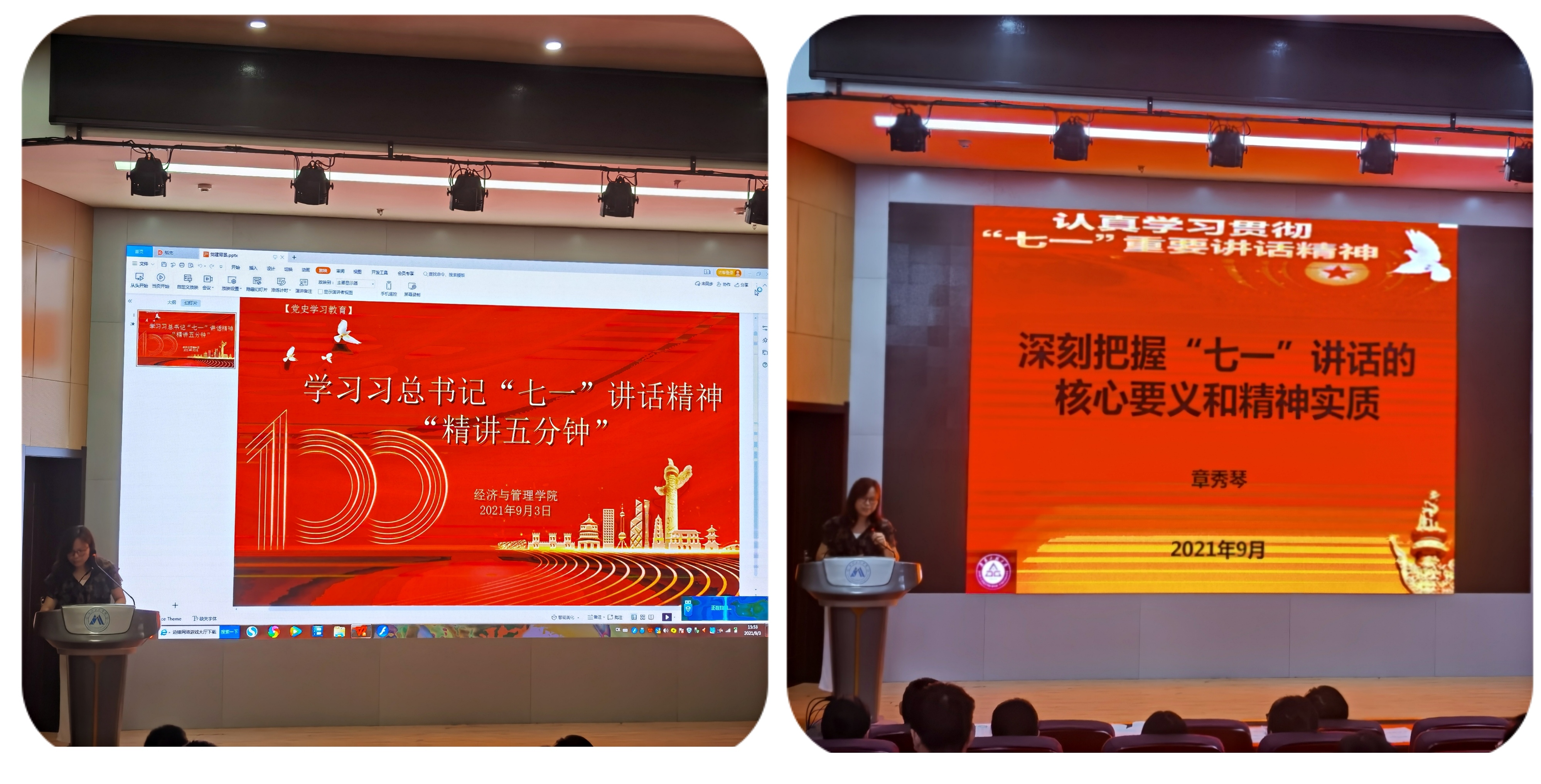 本网讯 9月3日,为深入学习贯彻习近平总书记“七一”重要讲话精神,提升政治理论学习成效,交流展示理论学习成果,引导学院全体教职工以更加昂扬向上的精神状态奋进新时代、走好新征程,经济与管理学院党委利用教职工周三学习时间组织开展学习习近平总书记“七一”讲话精神“精讲五分钟”系列沙龙活动。