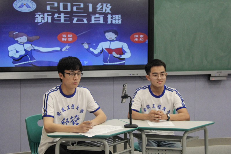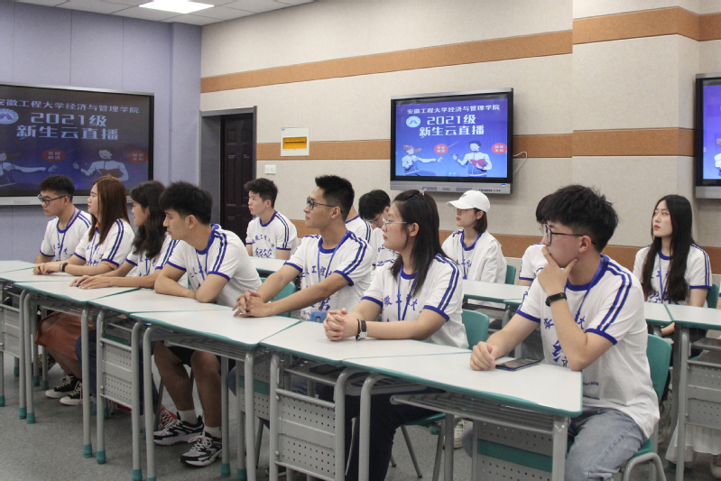 本网讯 青春澎湃,活力飞扬,9月12日,新生即将报到。为了让最可爱的萌新们尽快熟悉报到流程、了解大学生活、适应大学环境,7日晚7:00,经济与管理学院迎新云直播准时开始。学院党委副书记章兵、程繁,院团委副书记赵恒梅,2021级新生辅导员徐博、高天宇、赵妍、全体学长导员、院学生会主席团成员章开杨、徐敏等以及2019级学生代表方婧出镜本次直播。