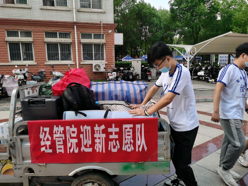 经管学院扎实落实我为新生办实事工作,迎新中提前租借多辆交通工具为新生提供行李搬运服务,三轮车、电动车、小推车,从接待处到宿舍楼下,从早到晚,不曾停歇,致力于为新生办实事。高效、便捷一直是我们学院志愿服务的代名词!