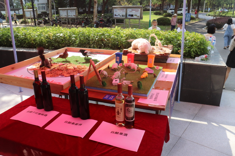 在迎新工作中充分发挥专业特长,通过在现场设置专业优秀作品展览区展示各专业自制、自酿以及自做的优秀作品,吸引不少师生纷纷驻足观看。自制的酸奶和小面包供新生品尝,让他们进校就能吃到来自食品科学与工程专业学长学姐们亲手准备的小零食;一席红布上整齐摆放着生物工程专业自酿的果酒和桑葚酒供新生观看,引得他们对所学专业的期待值以及好奇心猛增;数个由生物制药专业学生们自我设计和制作的生物标本模型供新生观摩,他们感叹于学长学姐们的创意和动手能力。
