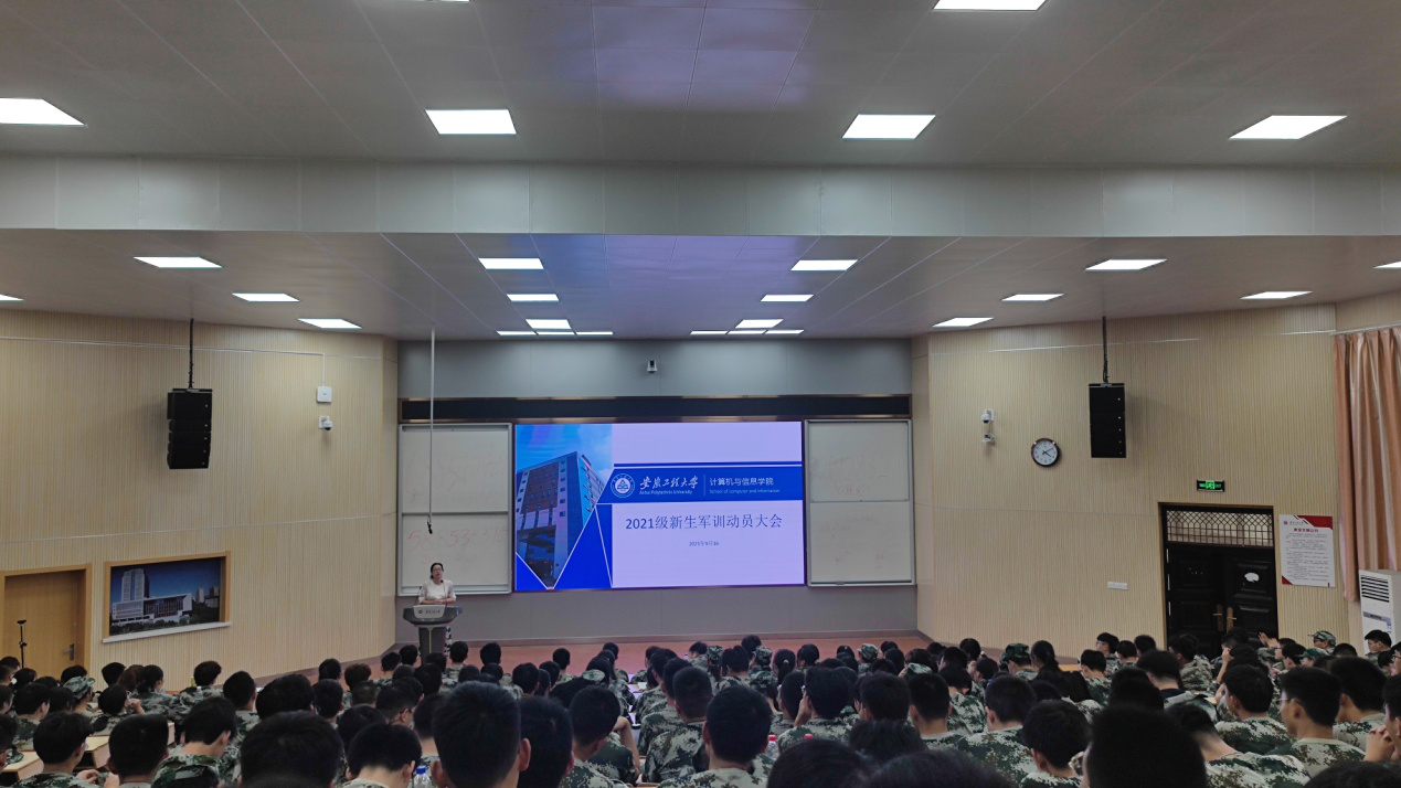 本网讯 9月16日下午,计算机与信息学院2021级新生军训动员大会在2教报告厅举行。计算机与信息学院党委副书记孙德茹、新生辅导员王鸣鹃和郭煜锋以及2021级全体参训同学参加了本次动员会。动员会由新生辅导员王鸣鹃主持。