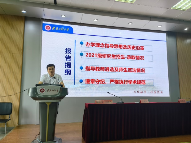 在入学教育环节,许德章代表学院领导向2021级研究生能够通过自身努力如愿考取研究生表示祝贺,并详细介绍了学院的学科体系、特色和优势,他希望各位研究生新同学能够珍惜学习的机会,立足新起点、迎接新挑战、力争创造新成绩,要求同学们调整状态,在新的学习阶段要有明确的奋斗目标,“做人”和“治学”两不误。王建平介绍了学校的办学理念和指导思想,以及学院研究生培养的历史沿革,要求同学们牢记“三做”理念,不忘初心,努力学习,争做德智体美劳全面发展的新时代担当青年,随后他还向同学们通报了2021级研究生的招生-录取情况、指导老师遴选及师生互选情况,同时要求大家严格遵守学校的管理规章制度和纪录,严守正确的学术道德与学术规范,并跟同学们分享了一些学术不端的案例,教导同学们要端正学习和研究的态度。研究生秘书吴路路老师从研究生管理、培养方案、培养计划、课程设置、毕业要求、奖助体系等方面为同学们做了细致全面的讲解。
