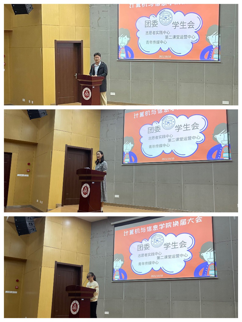 会议在嘹亮的团歌中拉开帷幕。两届团学组织成员代表依次上台发言,从自身出发,深刻阐明学生干部经历对自身组织、统筹、协调等能力的提升,从德智体美劳各方面促进了自我成长成才的作用,虽然工作会面临挑战和困难,仍旧很开心可以参与其中,体验过程中的收获和心得。他们希望新一届团学骨干成员能够端正工作态度,严守工作纪律,求真务实、脚踏实地完成工作任务,积极主动为校院两级团学工作添砖加瓦。数据科学212班叶晓珍作为代表发言,她表示,未来的日子里要将所学知识内化于心,“行之未言之前,言之于既行之后”。作为团学组织成员,应志存高远、脚踏实地,坚持集体主义,做到无私奉献。要勤于实践,深入调查,善于归纳,努力加强自身修养。守正笃实,勇于承担责任。