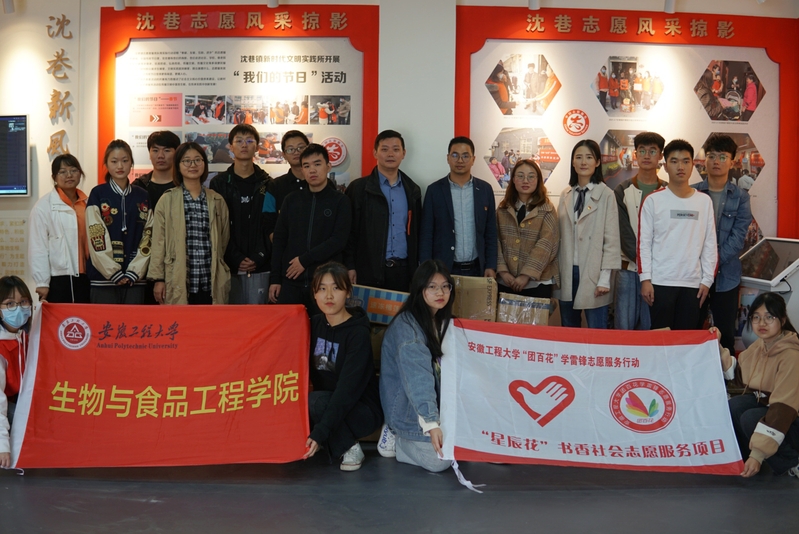 本网讯 2021年10月17日,安徽工程大学生物与食品工程学院团委联合团鸠江区委联合开展“我为青年做实事”之捐赠书籍活动,活动仪式在鸠江区沈巷镇新时代文明实践所举行。团鸠江区委书记、沈巷镇党委副书记倪翊,团鸠江区委科员杨洁、学院团委负责、辅导员以及“星辰花”志愿团队参加本次仪式。