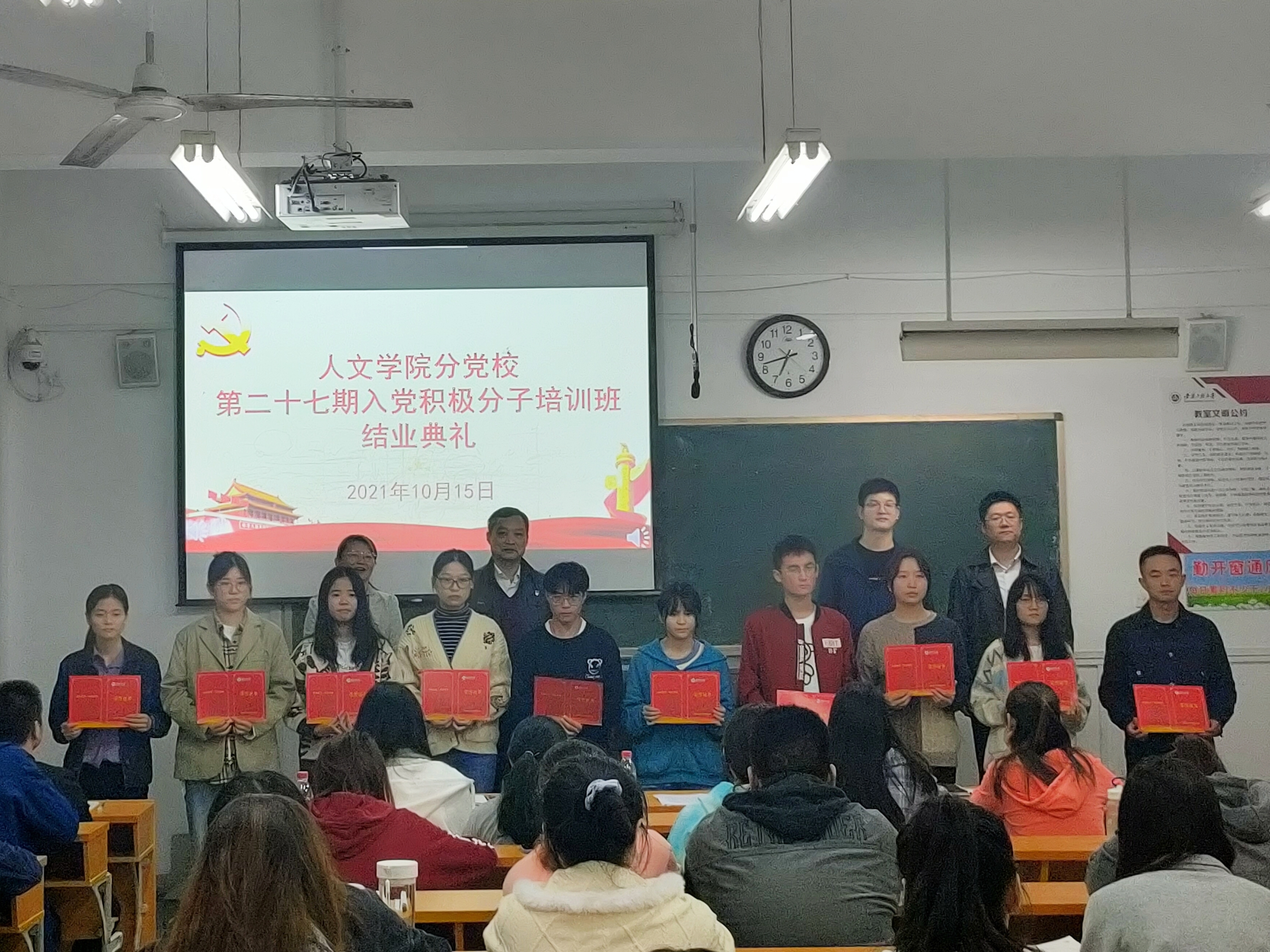 本网讯 2021年9月15日晚上,人文学院分党校第二十七期入党积极分子培训班结业典礼在4教205隆重举行,人文学院党委书记邓英扣、党委副书记金艾裙、组织员、班主任及第二十七期入党积极分子培训班全体学员共同出席了本次结业典礼。结业典礼由金艾裙主持。