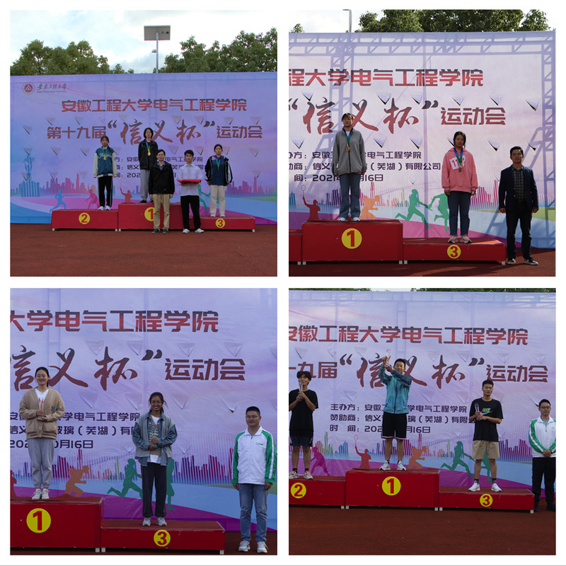 本网讯 10月17日,电气工程学院在第二田径场举办第十九届“信义杯”运动会。学院党委书记杨会成、副书记李恒奎、信义节能玻璃(芜湖)有限公司招聘经理代杰等现场观看比赛,并为获奖同学颁奖。