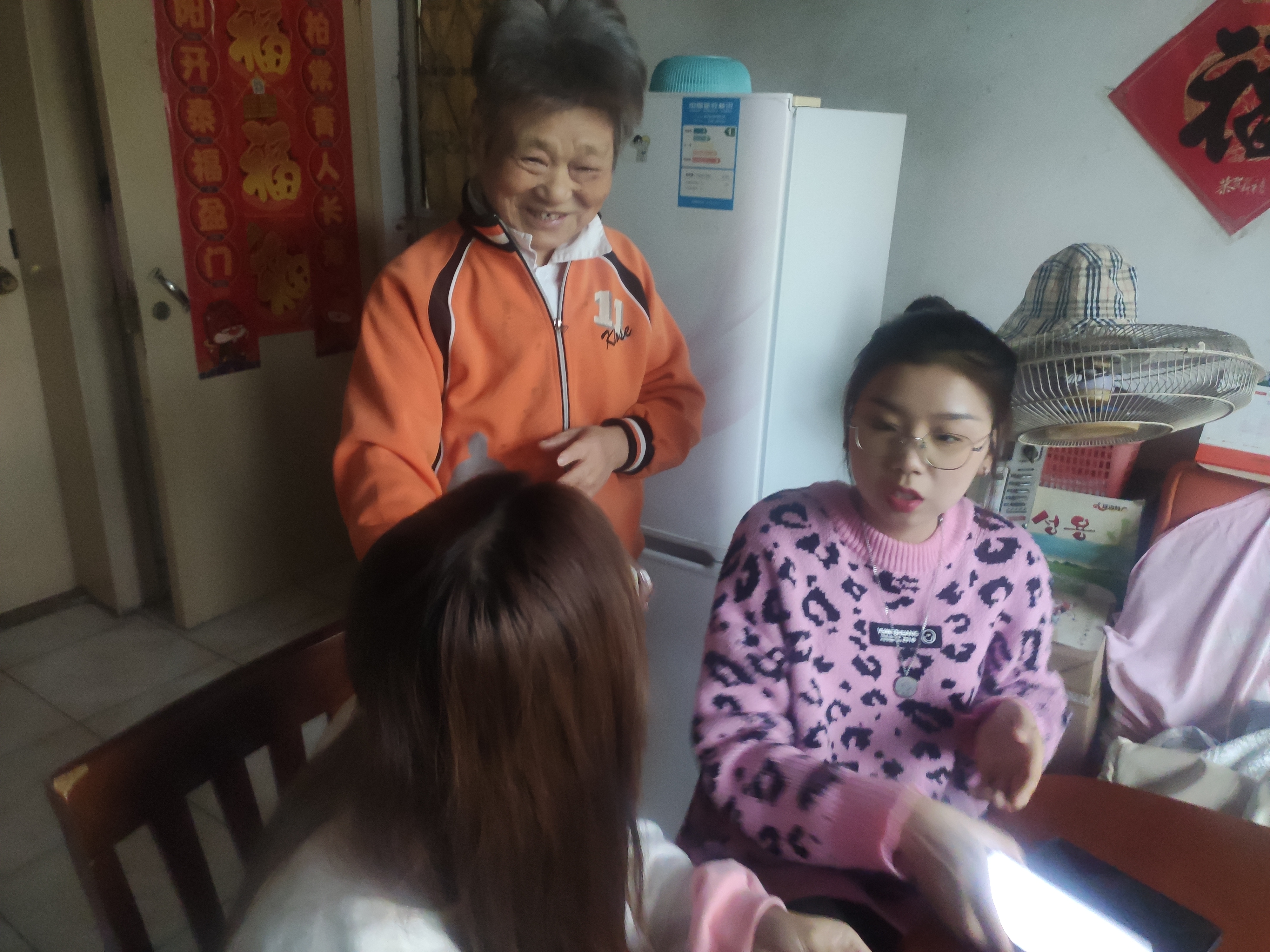 秋风夹着细雨,空气中弥漫着一股寒意,但老干部活动中心却是一片热火朝天,党员志愿者们与老同志们进行了深入交流,听老同志们讲述经历,回忆过往,这不单单是他们生命历程的回顾,也是老同志用一生践行初心使命的真实写照,这是一堂别具一格、生动形象的党史教育课。已达83岁高龄,入党45年的黄登山老师不断地嘱咐青年同志:“要认真地对待自己的工作,要不畏困难,要敢于面对困难”,话里满含着老党员对于新同志的殷切期盼。与此同时,另一队志愿者们来到了退休老教师金老师家中,为老人送去了秋日的温暖和问候。走访中,志愿者们不仅详细询问了老师们的身体、生活情况和存在的困难,还耐心地听老师讲述儿女的故事,并协助老师们操作智能手机,解决了微信登录等问题,氛围甚是融洽温馨。最后,在老同志们的送别声中结束了此次关爱活动。