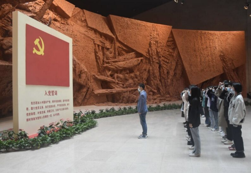 走进渡江战役纪念馆,首先映入眼帘的是习近平总书记2020年8月参观展馆时的重要讲话:“淮海战役的胜利是靠老百姓用小车推出来的,渡江战役的胜利是靠老百姓用小船划出来的。任何时候我们都要不忘初心、牢记使命,都不能忘了人民这个根,永远做忠诚的人民服务员。”一件件文献实物,一张张珍贵照片,让参观的师生们深切感受70多年前渡江战役那排山倒海般的恢宏气势。学生党员成焕晴表示:“渡江战役的历史启示我们,中华民族的伟大复兴离不开人民的支持。作为新时代大学生,必须自觉深入群众、联系群众和服务群众。”参观过程中,学生党支部书记张君还带领学生党员们面对党旗庄严宣誓,重温入党誓词,不忘奋斗初心。