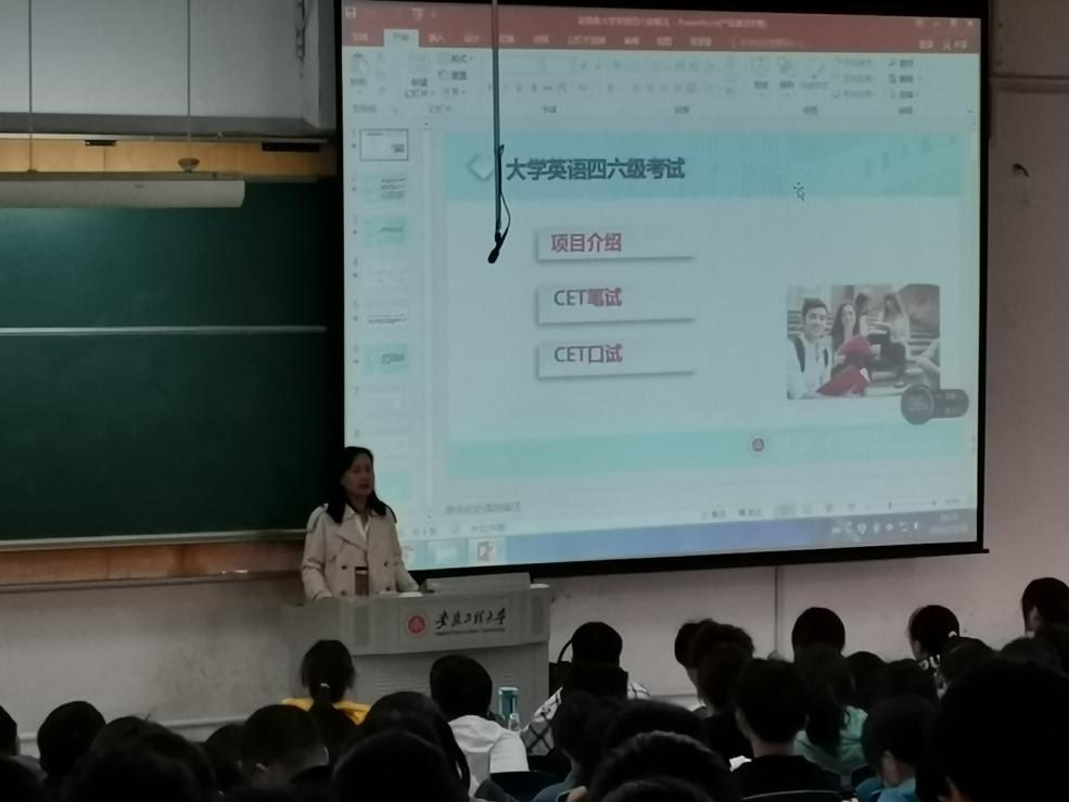 本网讯 10月28日下午,外国语学院大学英语第二教学部教师党支部在6J214举行英语四级公益培训,全校200余名大一新生参加。培训由大学英语第二教学部主任赵国春副教授主持,左言娜、袁学琴、张红雪、涂文婷四位骨干教师主讲。