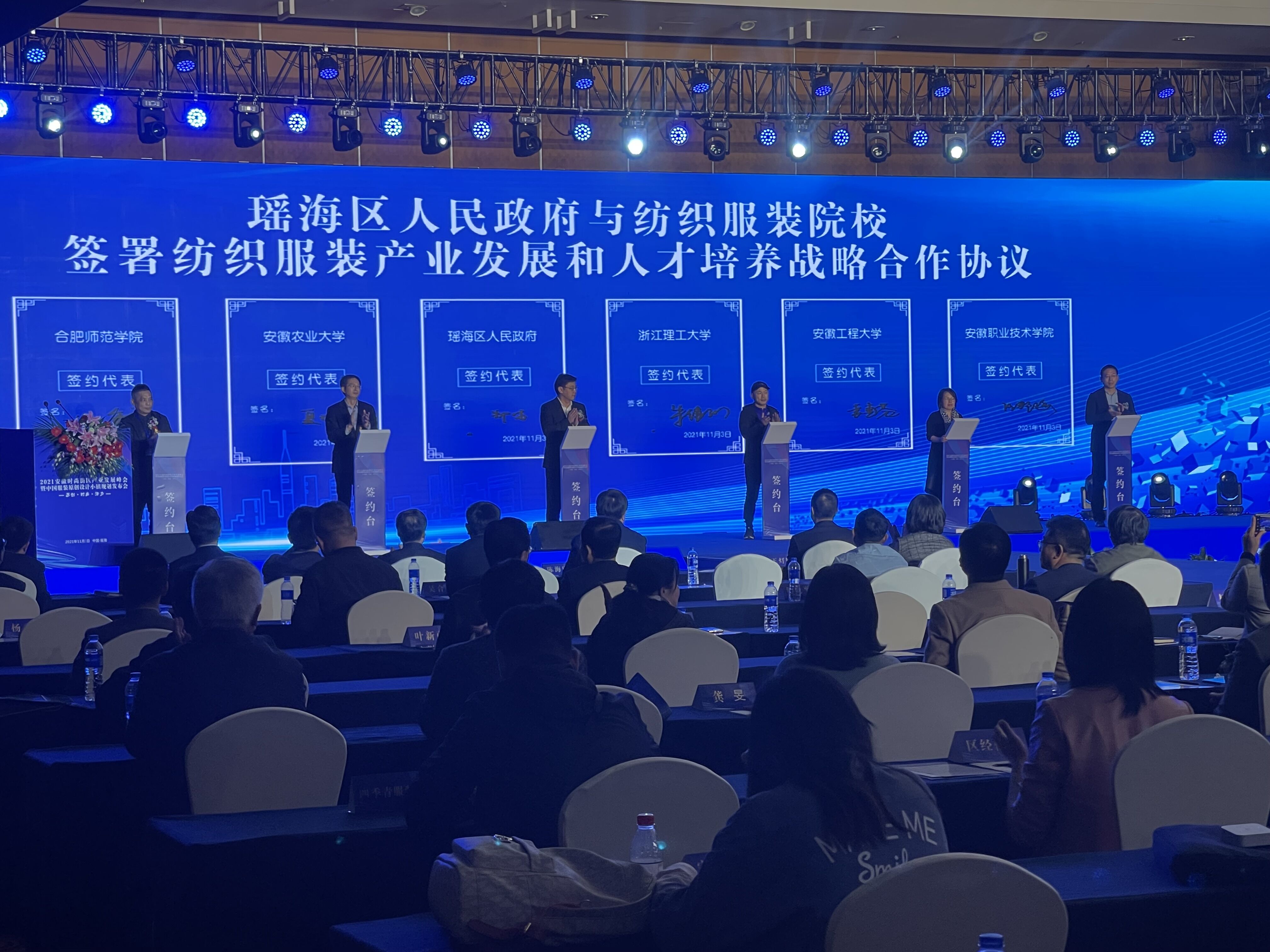发布会现场举行了一系列纺织服装产业人才签约和项目合作签约,合肥市瑶海区人民政府与浙江理工大学、安徽工程大学、安徽农业大学、合肥师范学院、安徽职业技术学院,安徽时尚街区与江苏省、浙江省服装设计师协会先后签订服装产业人才战略合作协议。我校纺织服装学院作为安徽省纺织服装专业院校代表参加发布会,并现场签约。