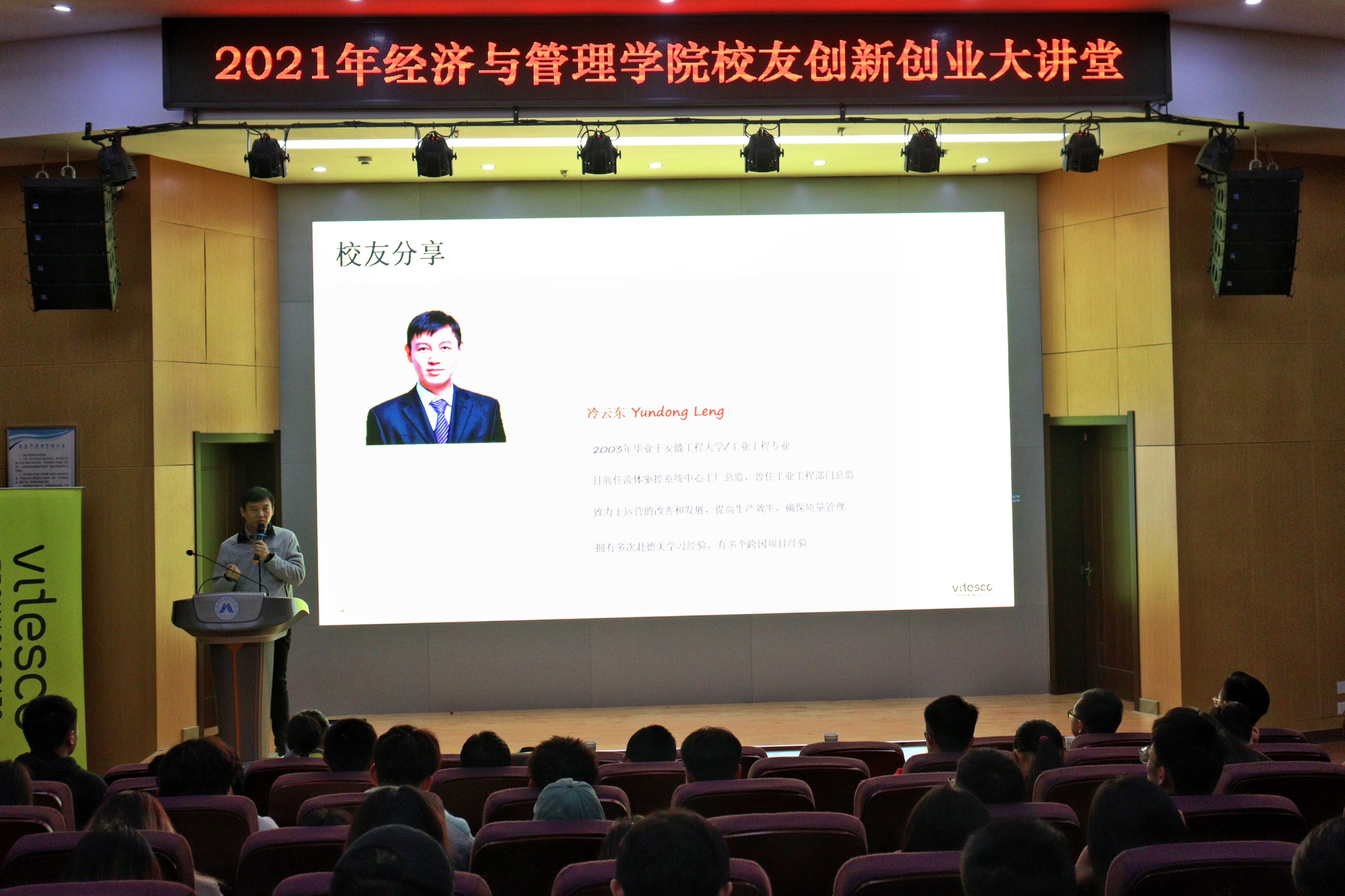 本网讯 为解决大学生对创新创业问题的疑惑,增强创新创业能力,11月17日下午,经济与管理学院在C座七楼报告厅举办了“校友创新创业大讲堂”专题报告会。此次活动有幸邀请到纬湃汽车电子有限公司中心工厂总监、99级工业工程专业知名校友冷云东先生及纬湃汽车电子有限公司人事部主管作专题报告,院党委副书记章兵、院长龚本刚、院党委副书记程繁、毕业班辅导员及18级工业工程专业、物流管理专业、质量管理专业学生出席本次活动。