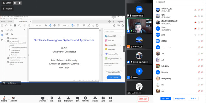本网讯 11月20日,数理与金融学院在线上举办了“随机分析”专题报告会,会议邀请了美国密歇根州立大学肖益民教授、东华大学闫理坦教授、美国康涅狄格大学殷刚教授作专题报告。校党委常委、副校长费为银教授出席了报告会,会议由安徽师范大学党委常委、副校长任永教授主持,英国思克莱德大学毛学荣教授、数理与金融学院部分教师和研究生聆听了此次报告会。