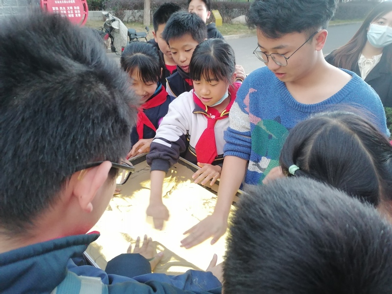 展览当天,丰富的展示设计作品吸引了安徽师范大学附属外国语学校城东校区广大师生的目光,大家汇集在展示现场驻足观看。有的孩子对着展板进行热烈讨论,有的孩子好奇地观摩作画,揣摩着作品的设计构思,还有的孩子拉着大学生志愿者问这问那……现场动漫人物绘画、建筑制图及沙画表演等更是把活动推向了高潮,处处洋溢着孩子们的欢笑声和鼓掌声。