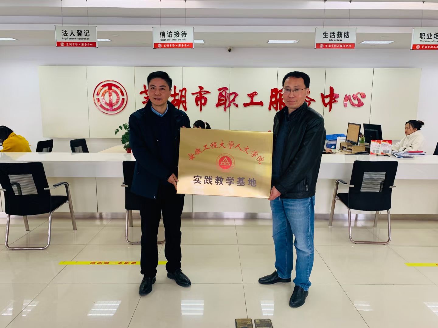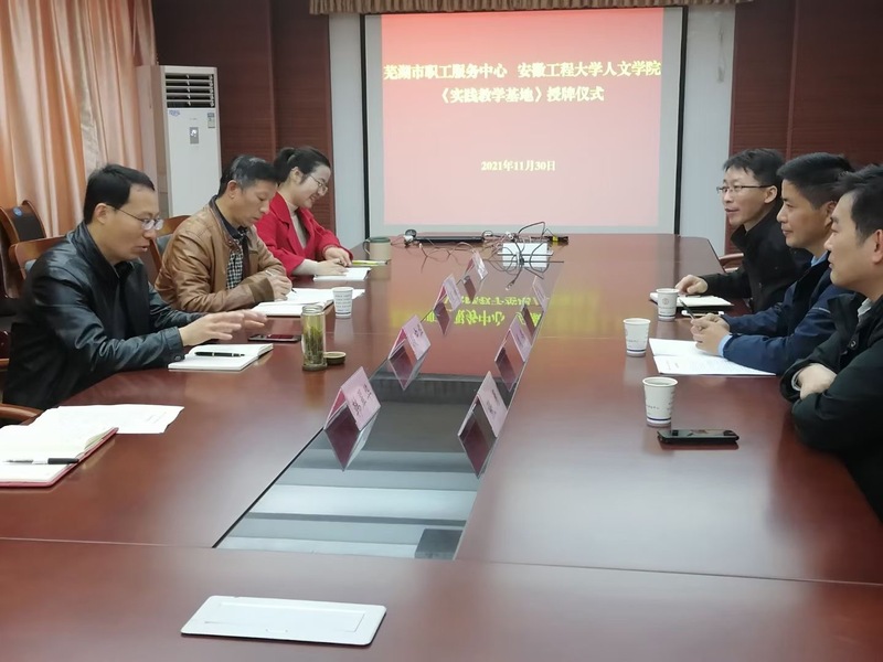 本网讯 为进一步加强专业实践教学,深化校企、校地合作,探索校企、校地协同育人的人才培养模式,强化专业人才培养与社会需求的对接。11月30日,人文学院与芜湖市职工服务中心共建实践教学基地签约暨揭牌仪式在芜湖市职工服务中心举行。人文学院副院长周伟、部分系主任及骨干教师,芜湖市职工服务中心主任段中华等参加了本次签约暨揭牌仪式。