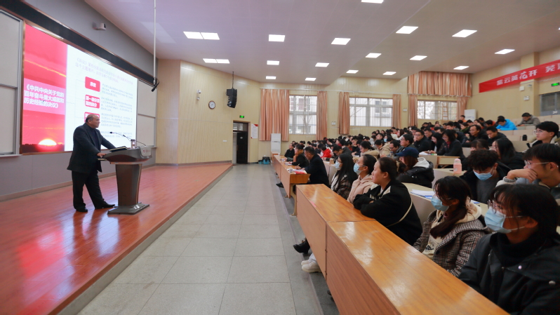 费为银紧紧围绕《中共中央关于党的百年奋斗重大成就和历史经验的决议》全面系统解读党的十九届六中全会精神,他强调要从党的十九届六中全会重大标志性成果角度,深刻认识百年奋斗重大成就和历史经验的重大意义、党的百年奋斗的初心使命和重大成就、中国特色社会主义新时代的历史性成就和历史性变革、党的百年奋斗的历史意义和历史经验,从党的百年奋斗历程中汲取智慧和力量,以优异成绩迎接党的二十大胜利召开。他要求全院师生学习贯彻习近平新时代中国特色社会主义思想,坚定“两个确立”,做到“两个维护”,继续在各项工作中保持良好的态势;他希望全体教师提高政治站位、立德树人、教书育人,争做“四有”好老师;全体学生加强政治理论学习、凝聚磅礴力量、创建优良学风,争做“五好”大学生。