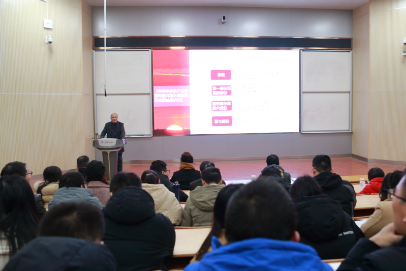 本网讯 12月15日,校党委常委、副校长费为银在二教报告厅为数理与金融学院师生宣讲党的十九届六中全会精神,宣讲会由学院党委书记周毅仁主持。