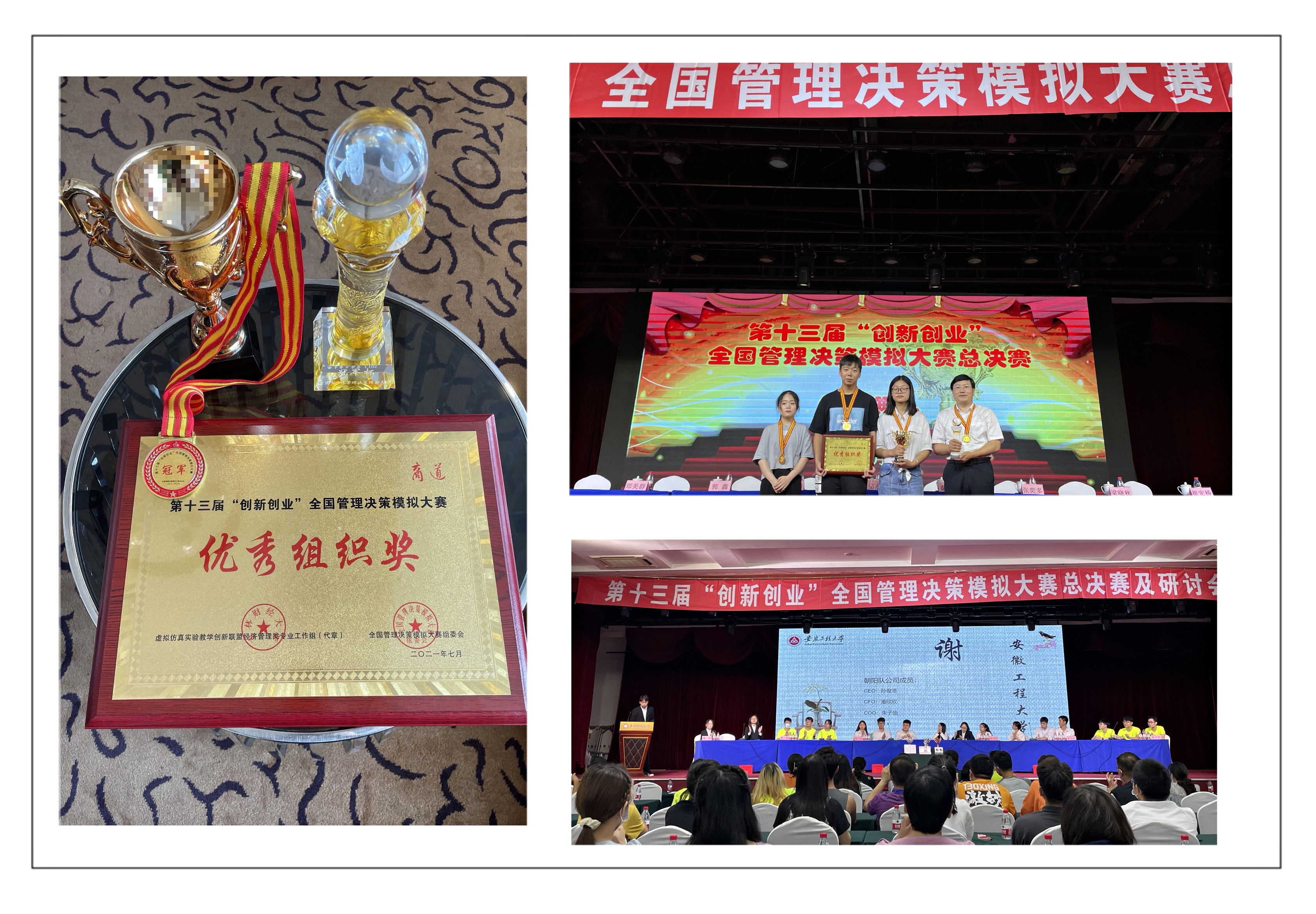 6.学子在国家高水平学科竞赛中成绩优异。2021年,我院学子喜获国家A类学科竞赛多项奖,在第十三届“创新创业”全国管理决策模拟大赛总决赛中勇夺“总冠军”,取得了该项赛事的突破性奖项;同时,学院还成功举办了全国大学生管理决策模拟大赛安徽省赛,并获优秀组织奖;在中国国际“互联网+”大学生创新创业大赛主赛道获国家级铜奖1项;在全国大学生物流设计大赛中获全国三等奖2项。
