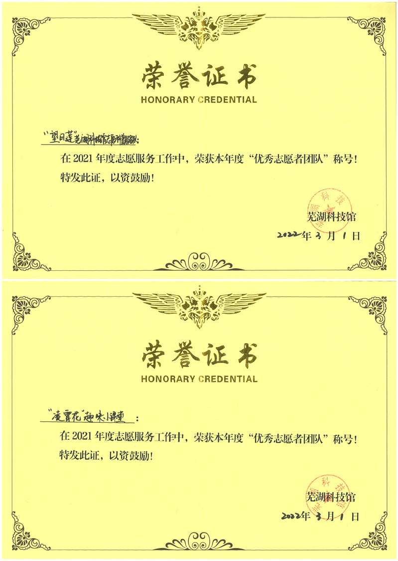 本网讯 3月5日,芜湖科技馆举行“文明芜湖·志愿有我”——2021年度芜湖科技馆优秀志愿者表彰仪式。电气工程学院“凌霄花”趣味小课堂志愿服务团队和“望日莲”科技馆科普志愿服务团队荣获芜湖科技馆2021年度“优秀志愿者团队”称号;常文卉等五名同学荣获芜湖市科技馆2021年度“优秀志愿者”称号。
