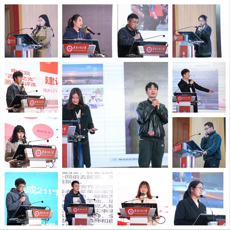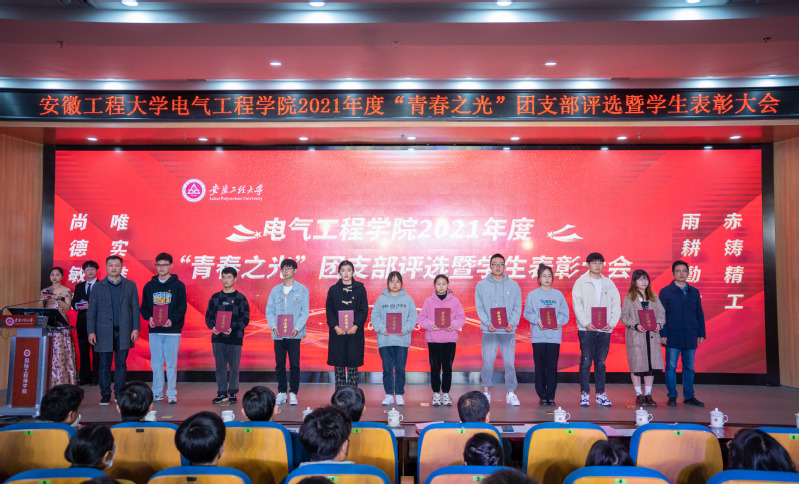 根据《安徽工程大学电气工程学院“青春之光”团支部评选办法》,从“青年大学习”、主题团日活动、班子健全、制度完善、活动丰富、改革创新等维度对学院各团支部进行了考核,共评选出21个“青春之光”团支部,并遴选出13个团支部在此次活动中进行了汇报展示。在大会的表彰颁奖环节,2020-2021学年校“三好学生标兵”“学生干部标兵”“科研活动标兵”“社会活动标兵”、星级学生宿舍、学风优良班级、先进班级、国家奖学金的获奖者,学校第八届“十佳大学生”,学校2021年度“十佳青年志愿者”,A类学科竞赛奖励和学院2021年度“青春之光”团支部获奖代表接受了表彰。