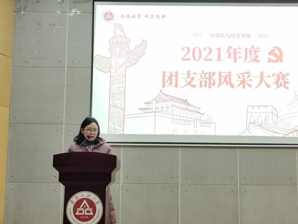 本次比赛以“不忘跟党初心 牢记青春使命”为主题,全方位展示了班级团支部锐意进取的精神,绽放了青春的风采。为遵守疫情防控要求,活动在腾讯会议同步直播,百余人次观摩了比赛全程。通过短视频、PPT等形式,经过初赛选拔的12支队伍向现场评委和全体观众展示了团支部建设成果与实践育人成效,在班团一体化建设中,对德智体美劳全面发展工作的重视。大家共同学习、积极进步,从集体荣誉到优秀个人,从班级建设到志愿服务,通过新媒体平台宣传展示,一个个健康、团结、温暖的团支部呈现在大家面前。软件191团支书孟延从2021年6月的最后一次晚自习结束展开叙述,将支部建设的点滴和风采娓娓道来,从思想引领到班团建设,从科技竞赛到志愿服务,从学风建设到五育并举,软件191班从未停止过追梦的脚步,一直奋进、一路欢歌,把成长和成才作为大学生活的主旋律,从团日活动到主题班会,从团百花的“素心兰”垃圾分类志愿服务小队到“互联网+”的红色筑梦小队,从篮球赛到运动会,到处都能看到他们忙碌又充实的身影;快乐、阳光、感恩、奋进,这个走过大学一半旅程的团支部正努力将这一曲青春之歌唱的悠扬而嘹亮。