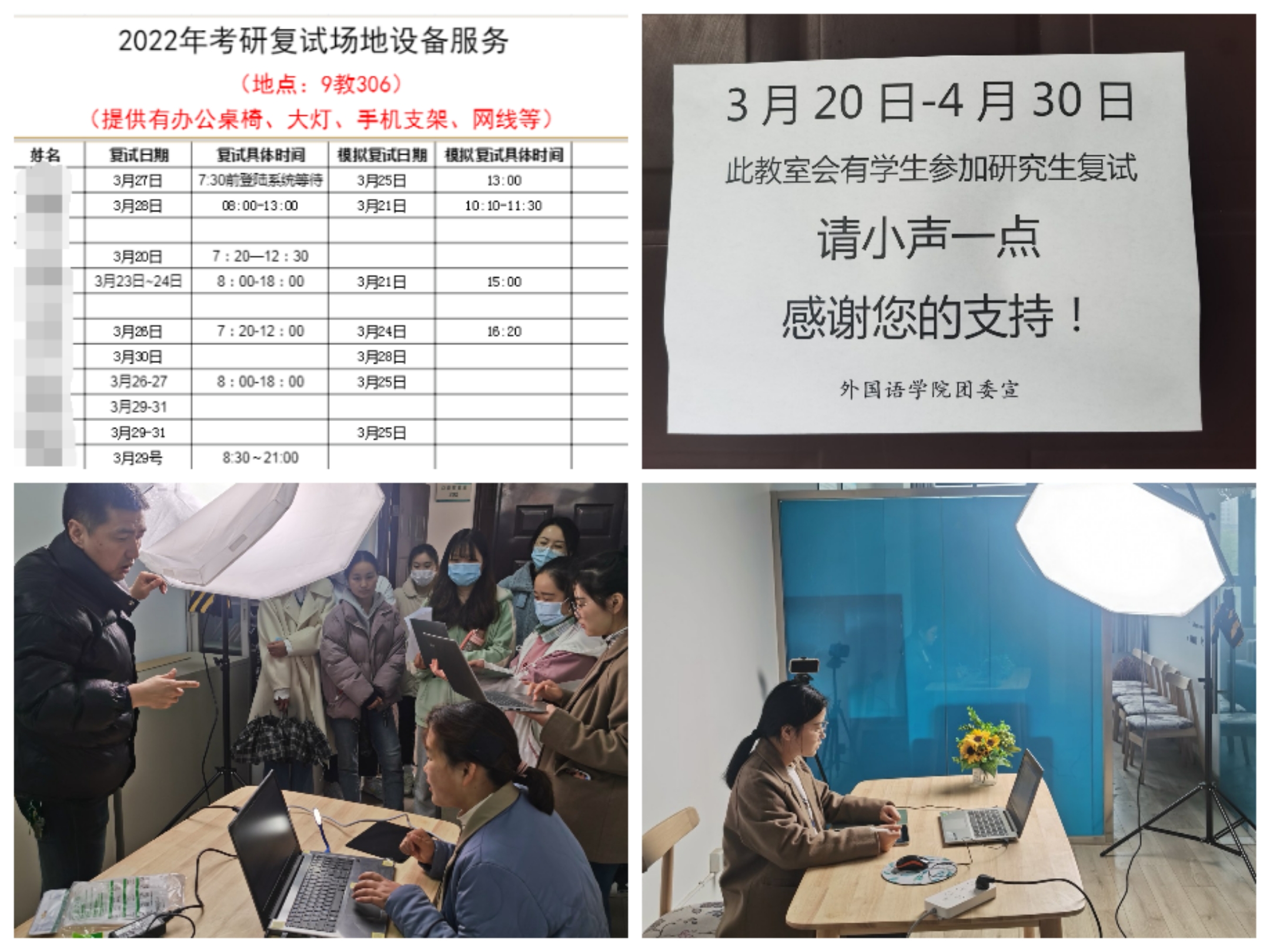 3月20-25日,为应对疫情影响,解决学生线上复试遇到的场地难题,学院专门将9教306布置成考研复试室,学院语言中心主任卢祥老师利用休息时间为同学们调试补光灯、三脚架、电脑等设备,为即将参加复试的同学们做好后勤保障,辅导员张君也逐一登记好同学们复试的时间并安排大家参加复试模拟。