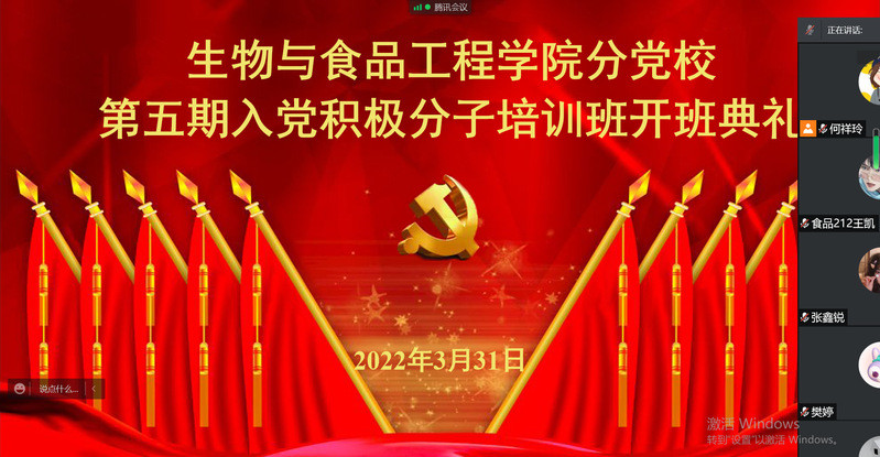 本网讯 3月31日中午,生物与食品工程学院分党校第五期入党积极分子培训班通过腾讯会议举行班线上开班典礼。学院党委副书记王辉、辅导员胡晓康、本科生以及研究生102名学员(包含14名马克思主义学院研究生)参加了此次开班典礼。典礼由培训班班主任何祥玲主持。