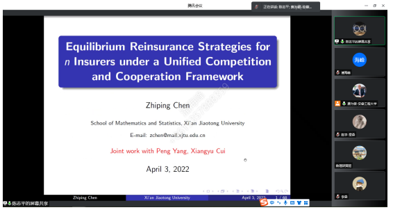 陈志平教授作题为《Equilibrium reinsurance strategies for n insurers under a unified competition and cooperation framework》的报告,考虑多个保险人之间竞争与合作的关系,他在连续动态框架下构建了理论模型,并进行仿真模拟,给出具体的经济学含义,系统探讨再保险的最优策略问题。