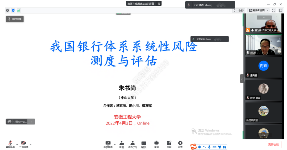 本网讯 4月3日,数理与金融学院举办了线上金融专题系列报告会,会议邀请到南京大学肖斌卿教授、西安交通大学陈志平教授、中山大学朱书尚教授作专题报告。校党委常委、副校长费为银出席报告会。数理与金融学院部分教师及相关专业研究生参加了报告会。