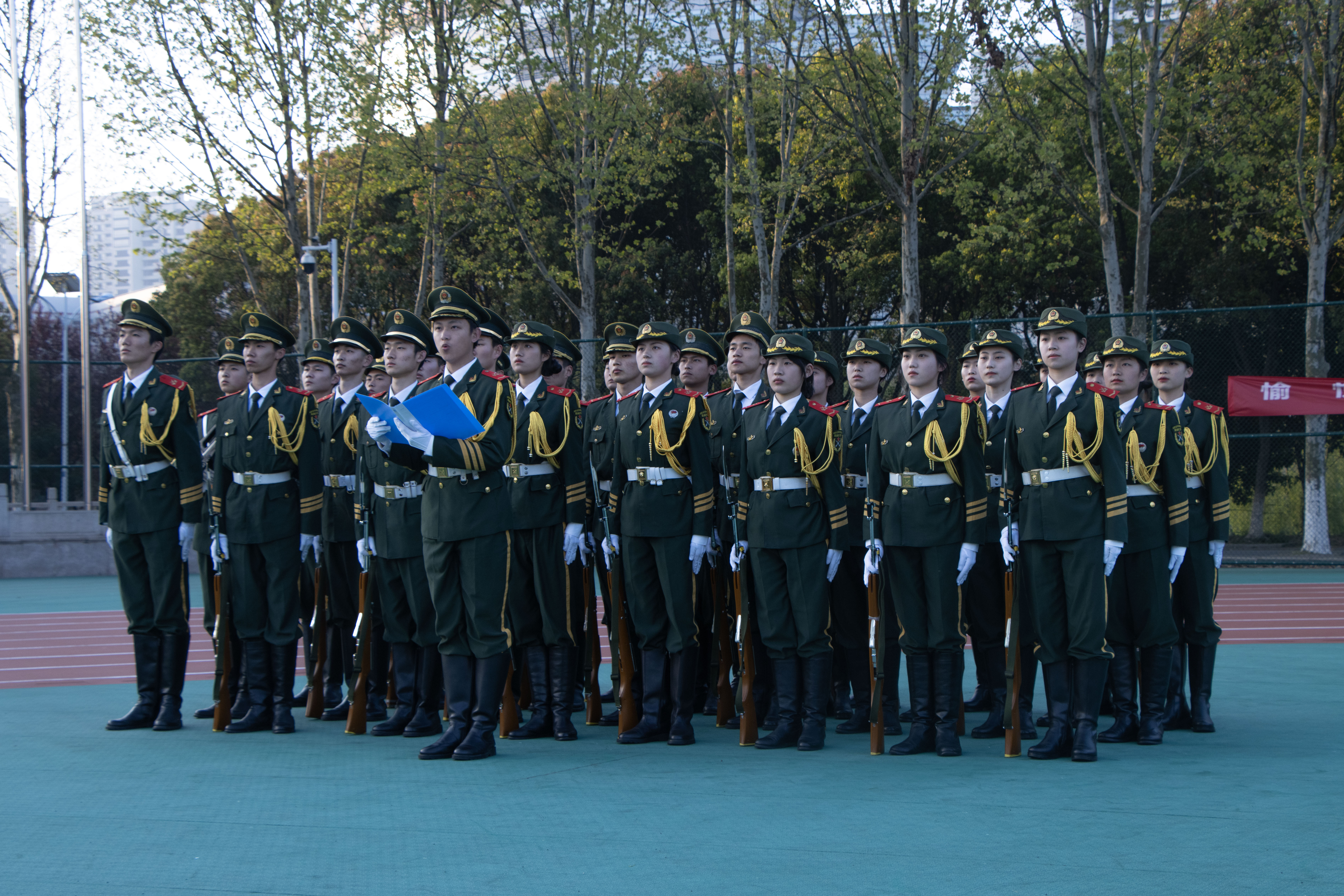升旗仪式开始,国旗护卫队迈着整齐而有力的步伐护卫国旗进场。“升国旗、奏国歌,敬礼!”伴随着国歌声响起,在场所有人庄严肃立,向国旗致以庄严的注目礼。