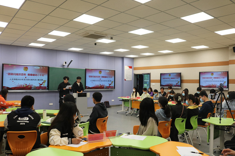 本次决赛分为线上、线下两个会场,主要分为三个阶段。第一阶段,各参评团支部分别从班子建设、团员管理、活动开展、制度落实、作用发挥等五个方面对支部的重点举措、特色成效与日常工作进行介绍与展示;第二阶段,各支部以朗诵、视频、诗歌等多种形式展示了团员青年的青春活力与昂扬的斗志,考虑到疫情防控要求比赛现场播放部分团支部才艺视频;第三阶段,知识竞答采用必答+抢答相结合的形式,各团支部参赛同学积极抢答,现场气氛热烈。
