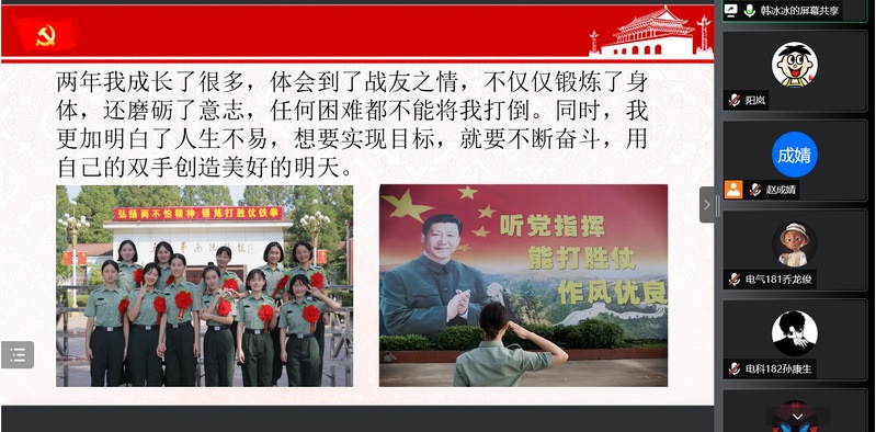 本网讯 为切实做好2022年征兵工作,帮助毕业生和家长更加详实地了解国家征兵政策。电气工程学院利用腾讯会议平台召开大学生征兵政策宣讲会。会议邀请校征兵工作站赵成婧老师,线上为学生及家长讲解参军入伍相关政策;邀请退役复学优秀学生代表韩冰冰、张艺分享军营生活。学院党委副书记李恒奎出席会议,毕业班全体辅导员、近200名毕业生与部分学生家长参会,会议由学院征兵工作联络人阳岚老师主持。