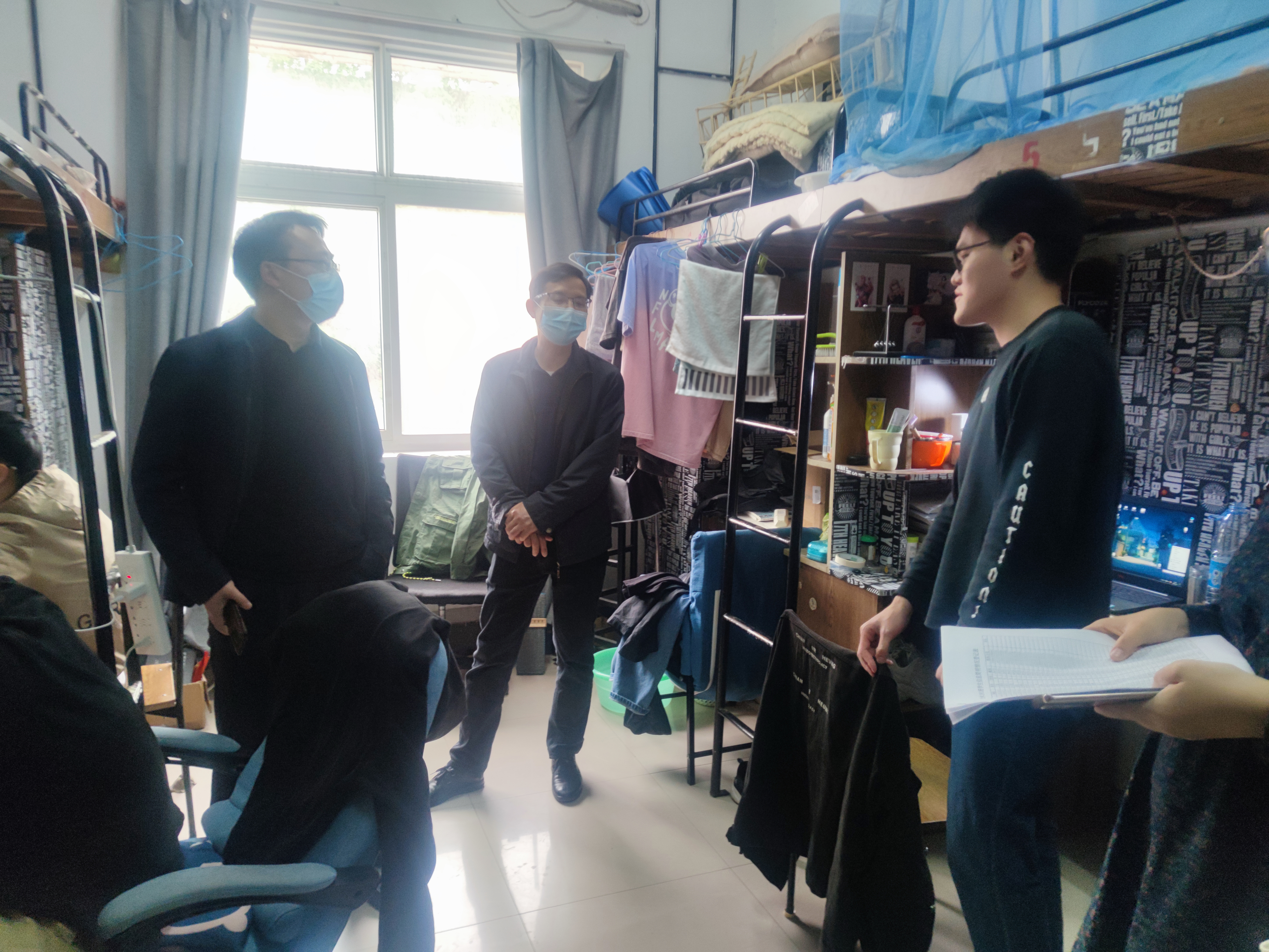 学院党政领导分两组深入学生宿舍,院党委书记张国友、副书记李烨走访男生11栋宿舍,院长徐达奇、副院长张金轮走访男生2栋。走访中,张国友一行与学生亲切交谈,详细询问在校学生的学习、生活情况,及时传达学校疫情防控措施和管理办法,要求学生非必要不离开学校、避免去人员密集的场所,确需外出的要严格履行请假审批手续,做好个人防护措施,坚持日常打卡,落实“日报告”“零报告”制度,同时要求辅导员精准摸排疫情防控下学生身心健康状况。徐达奇叮嘱大家要注意增减衣物,预防感冒,坚持“两点一线”的学习和生活,严格落实线上教学的相关要求,及时跟任课教师交流沟通,他鼓励在校学生课余时间积极锻炼身体,增加个人免疫力,并且严格遵守学校疫情防控规定和要求,严禁翻墙出校,要求学生宿舍做好消杀工作,定期通风透气,学生个人及时晾晒被褥衣物,齐心协力共同抗击疫情。
